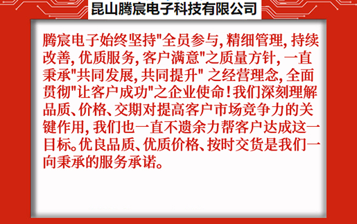昆山騰宸電子科技有限公司位于中國線路板加工之都昆山千燈,公司專注于電路板研發(fā)設(shè)計、PCB抄板、元器件采購、SMT貼片加工、組裝測試,為客戶提供一站式電子制造服務(wù)。騰宸電子始終堅持"全員參與,精細(xì)管理,持續(xù)改善,優(yōu)質(zhì)服務(wù),客戶滿意"之質(zhì)量方針,一直秉承"共同發(fā)展,共同提升" 之經(jīng)營理念,全面貫徹"讓客戶成功"之企業(yè)使命!我們深刻理解品質(zhì)、價格、交期對提高客戶市場競爭力的關(guān)鍵作用,我們也一直不遺余力幫客戶達成這一目標(biāo)。優(yōu)良品質(zhì)、優(yōu)質(zhì)價格、按時交貨是我們一向秉承的服務(wù)承諾。 ...